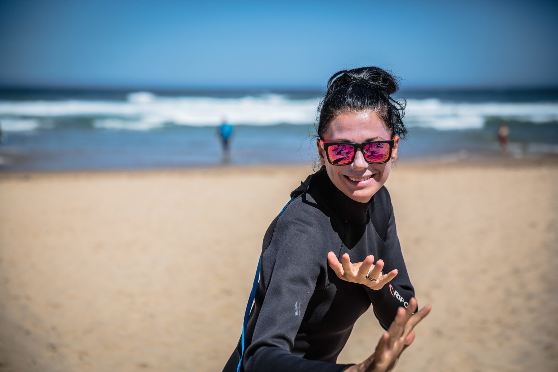 Merci à Sabine, monitrice exceptionnelle, engagée, enthousiaste, qui adore manifestement son travail. Merci Zac et Dom pour la qualité des explications techniques et le suivi des surfers.